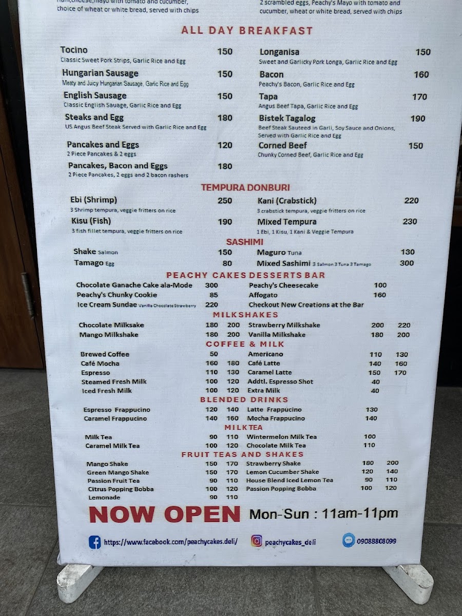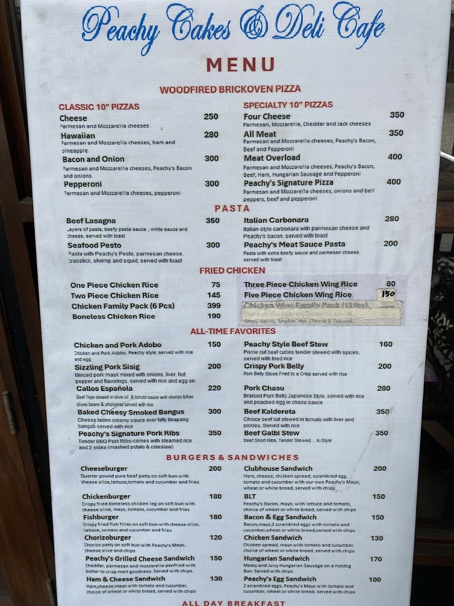 - Desserts: Indulge in their signature Peachy's Chunky Cookie or choose from a range of cheesecakes, including Blueberry, Strawberry, and Mango, all priced reasonably around ₱130.00.